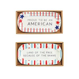 Celebrate the spirit of America with the Proud to Be an American Sentiment Tray from our 1776 Collection. This ceramic tray features the heartfelt phrase “Proud to Be an American” framed by a festive hand-painted red, white, and blue rim with raised in-mold star details. Perfect for serving small treats, holding jewelry, or displaying as a decorative accent, this charming tray brings a touch of patriotic pride to any home.