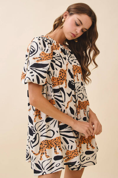 CD05962-Leopard Print Gathered Round Neck Mini Dress: CREAM / S