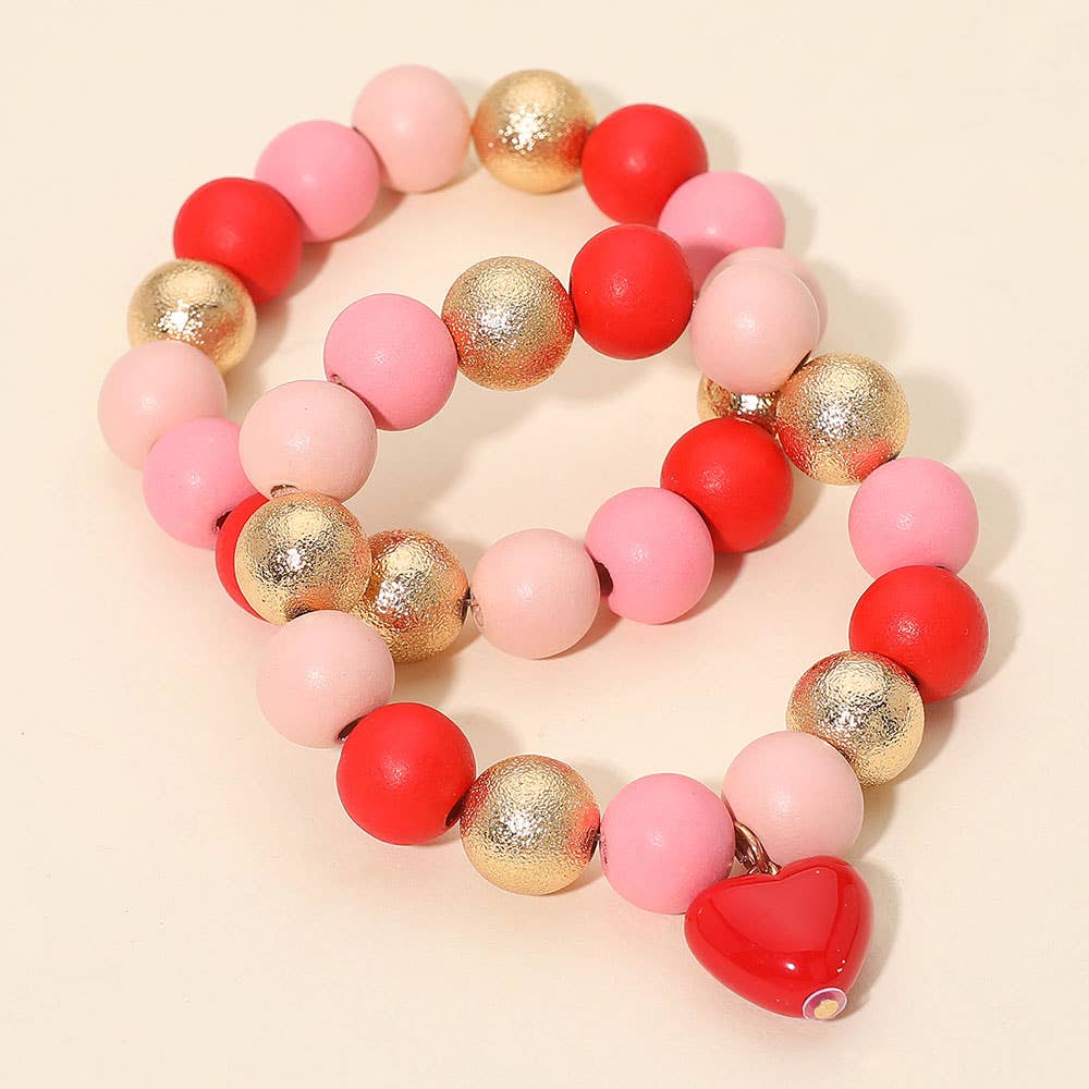 Layer on the love with this Pink & Red Chunky Heart Charm Bracelet, a versatile accessory that brings instant joy to your wrist. Featuring adorable heart charms measuring 0.7" x 0.6" on a stretchable double stack bead design, this bracelet slips on effortlessly for a comfortable, all-day wear experience. Mix and match with other pieces to create your perfect stack, or let it shine solo as a standalone statement. Whether you're dressing up for a special event or keeping things casual, this charming bracelet adds personality and warmth to any ensemble. Lead and nickel compliant for safe, worry-free styling.