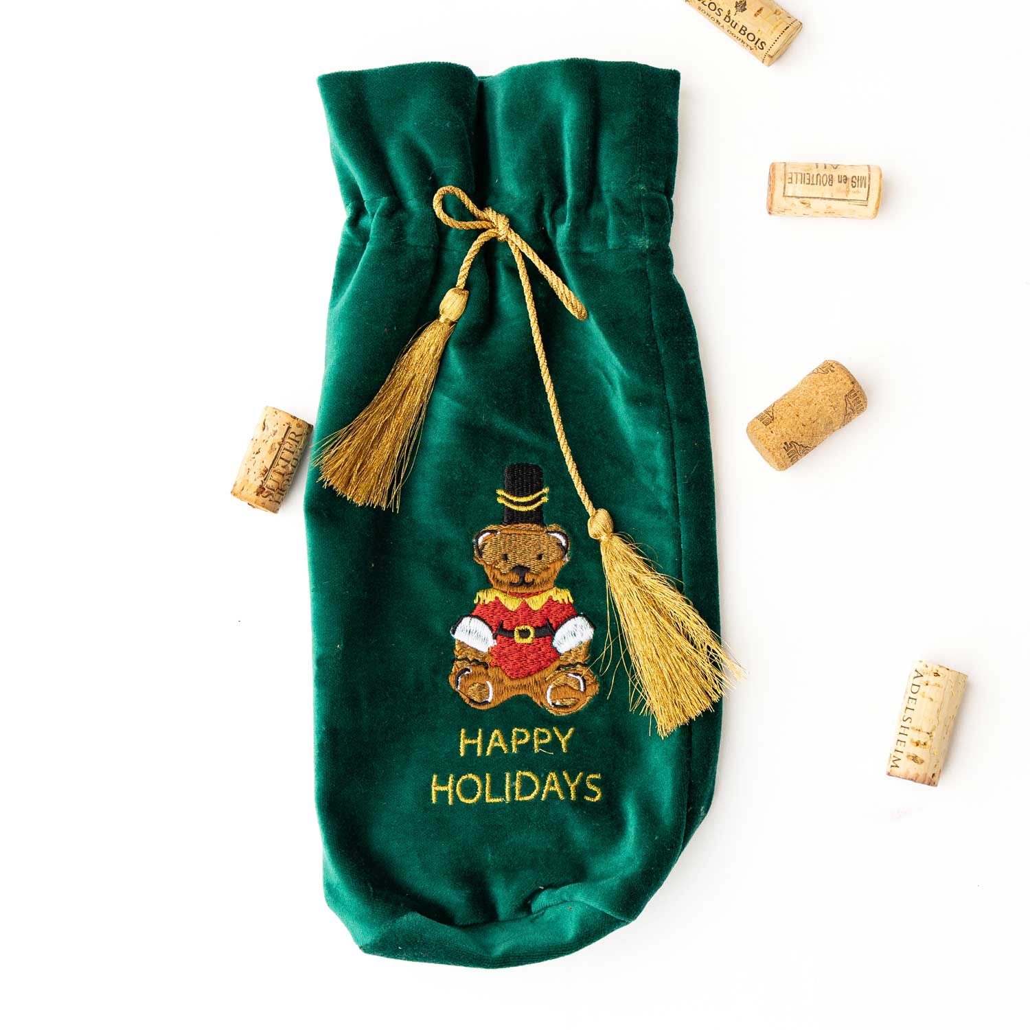 Throw the most festive shindig of the century with our Teddy Bear Embroidered Wine Bag. With its velvet embroidery and tassel tie drawstring, your gift will be sure to have a touch of elegance that’ll get all your guests ready to dance! Fit up to a 750ml bottle of champagne, vodka - or whatever your heart desires! Make your celebration extra special with our other disco-themed items; together they make the perfect gift package ready for grooving! The Teddy Bear Embroidered Wine Bag is a glitzy way to enjoy those special occasions. 13" x 6.25" Holds a 750ml Bottle of Alcohol Designed in the USA; Imported