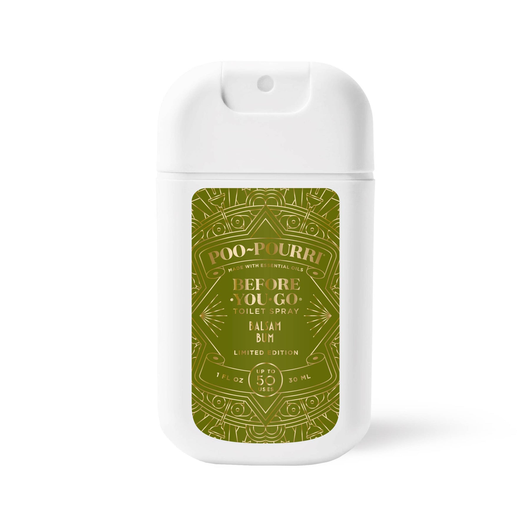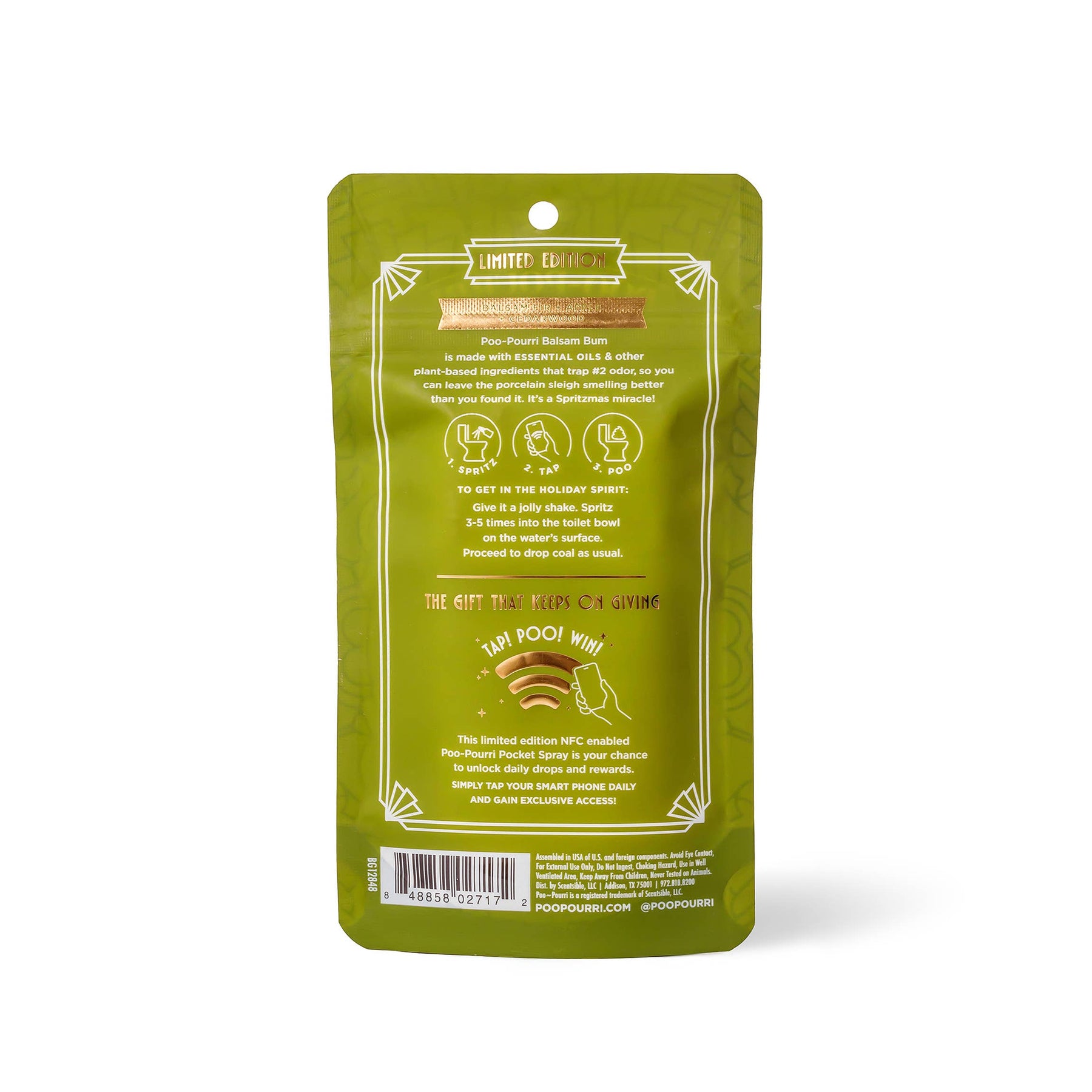(24) pouched pocket sprayers, 1oz (100 uses) Nothing says home for the holidays like the smell of a freshly-trimmed tree. Get the scent of the season by chopping a different kind of log with Poo~Pourri Balsam Bum. It's a woodsy blend of spruce, balsam, cedarwood and fir needles brightened with red berries and apple. It's giving us main character energy of a Hallmark movie about a big city business woman sent to a small town to run her family's Christmas Tree Farm—and we're here for it. • Limited Edition Scent & Tap Enabled Bottle. Tap into holiday magic—and exclusive gifts—with this seasonal scent • Makes a Great Gift. Poofect for White Elephant parties, stocking stuffers, and more! • Works Guaranteed. Traps poo odors—100% guaranteed • Travel Friendly. Pocket sized sprayer makes it easy to GO on the go balsam fir + apple + cedarwood Top: Red Berries, Apple Middle: Fir Needles, Spruce Base: Cedarwood, Balsam
