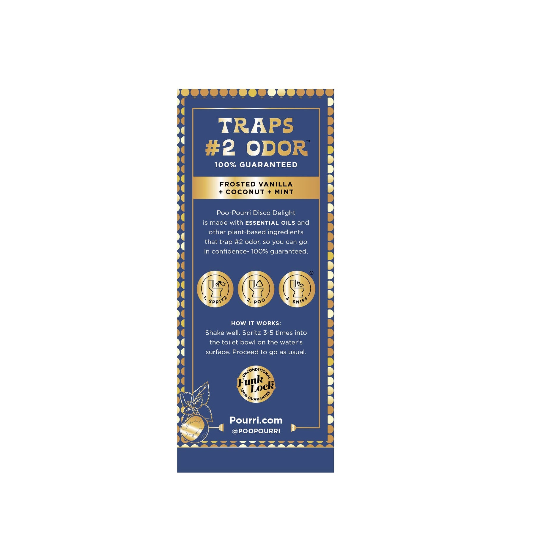 Let's take it back. You're 8 years old, helping your mom bake cookies for Santa (Mom’s favorite kind of cookie which I’m sure just happens to be a coincidence). Poo~Pourri Disco Delight is the perfect recipe of sugary, sweet notes of vanilla, warm coconut, and a garnish of mint that leave your freshly baked #2s smelling like Christmas cookies fresh-out-of-the-oven. • Limited Edition Scent. Deck the stalls with this new seasonal scent! • Makes a Great Gift. Poofect for White Elephant parties, stocking stuffers, and more! • Works Guaranteed. Traps poo odors—100% guaranteed • Fresh & Clean Formula. Formulated without funky ingredients • Smells Amazing. Made with essential oils and leaves the toilet smelling like sugar, spice, and everything nice frosted vanilla + coconut + mint Top: Frosted Vanilla, Rhubarb, Strawberry Crème Middle: Mint, Coconut Base: Sweet Cream, Sandalwood