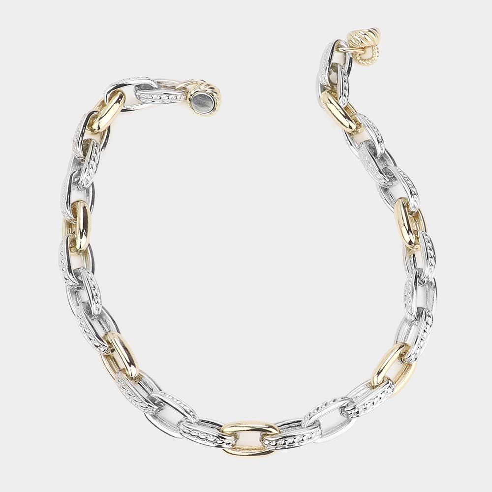 Elevate your accessory game with this striking two-tone chunky chain necklace, where modern sophistication meets everyday wearability. Measuring 17 inches with a refined 0.5-inch pendant, this bold piece commands attention without demanding effort—thanks to its innovative magnetic clasp that keeps you secure and comfortable all day long. The luxurious 14K gold plating delivers that coveted luxury aesthetic while the substantial link design ensures durability that matches its undeniable style. Whether you're dressing up for an evening out or adding edge to your casual wardrobe, this versatile statement necklace transitions seamlessly from day to night, making it an essential addition to any jewelry collection.