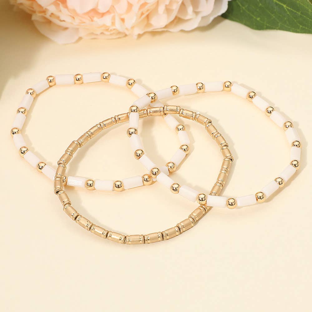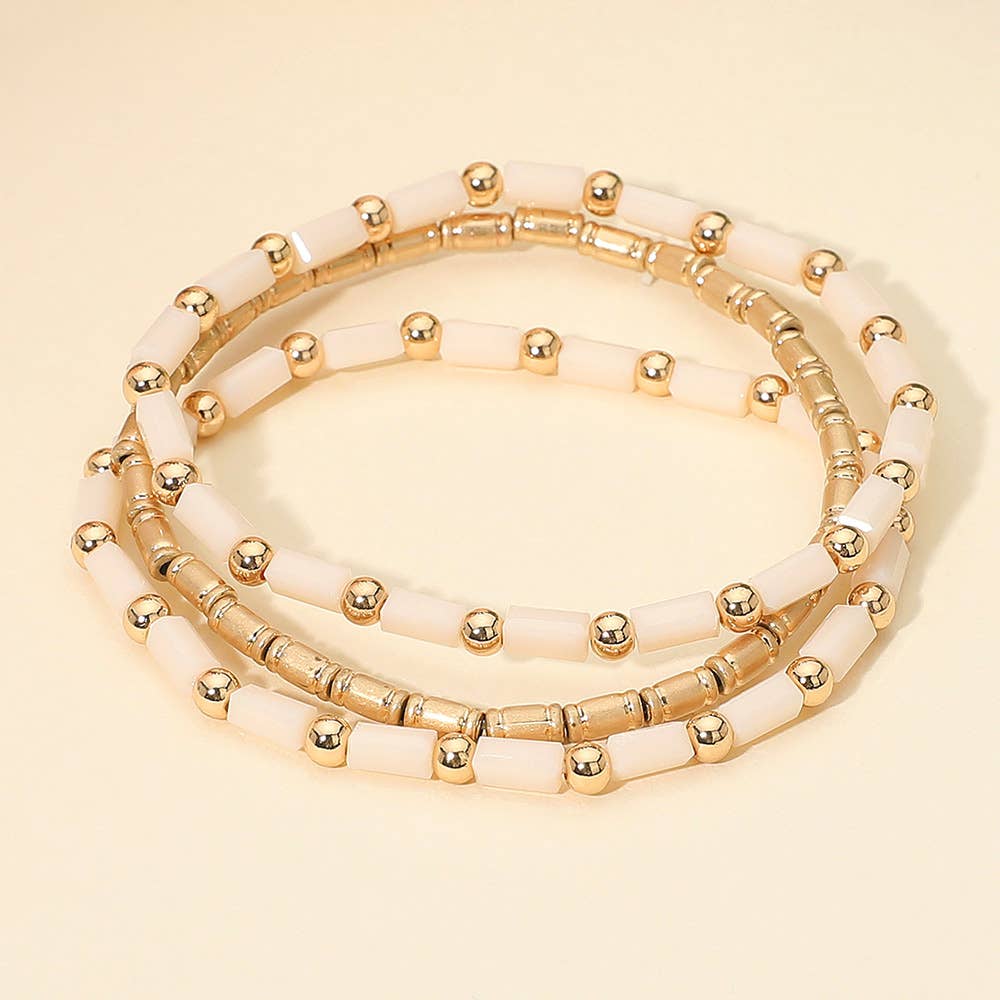Transform your wrist stack with this elegant white beaded bracelet set. Combining timeless round and rectangular beads in a refined palette, these stretchy bracelets adapt to your personal style and mood. Slip them on instantly—no clasps needed—and layer them for maximum impact or wear individually for understated elegance. Whether you're heading to the office or a special event, this versatile collection delivers sophisticated style every time. Lead and Nickel Compliant.