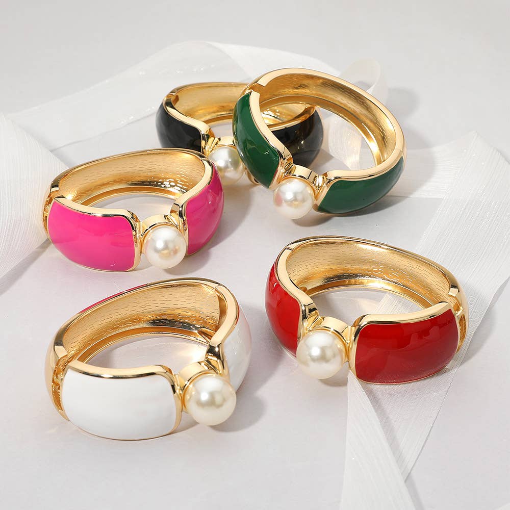 Elevate your accessory game with this striking wide cuff bracelet, designed to command attention. The smooth enamel finish in rich brown and gold tones provides a luxurious backdrop for the bold central pearl accent that serves as the focal point of this sophisticated piece. Measuring 1.2" H x 2.5" D, it offers the perfect balance of presence and wearability. The secure hinged closure ensures comfort and stability throughout your day, while the polished finish transitions seamlessly from office to evening events. A versatile statement piece that transforms any ensemble with understated glamour. Lead and Nickel Compliant.