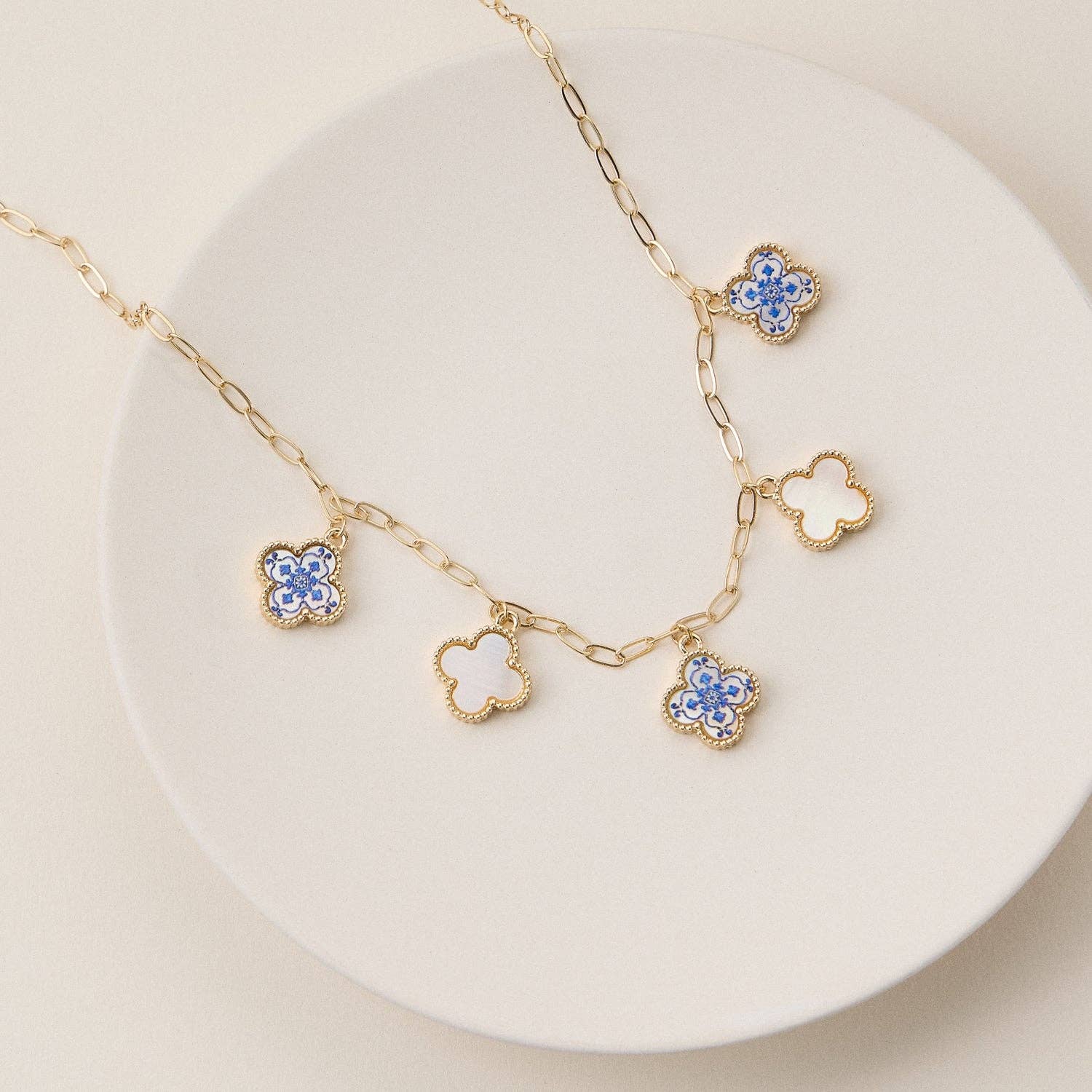 The Blue Floral & Pearl Clover Charm Necklace blends elegance and whimsy with a timeless touch. Featuring alternating charms of blue floral-patterned mother of pearl and luminous white mother of pearl, each clover pendant is delicately framed in textured gold-tone metal. The necklace is set on a modern gold paperclip chain with an adjustable clasp, making it ideal for layering or wearing on its own. Inspired by vintage tile motifs and luxe materials, this piece is perfect for everyday wear or gifting.