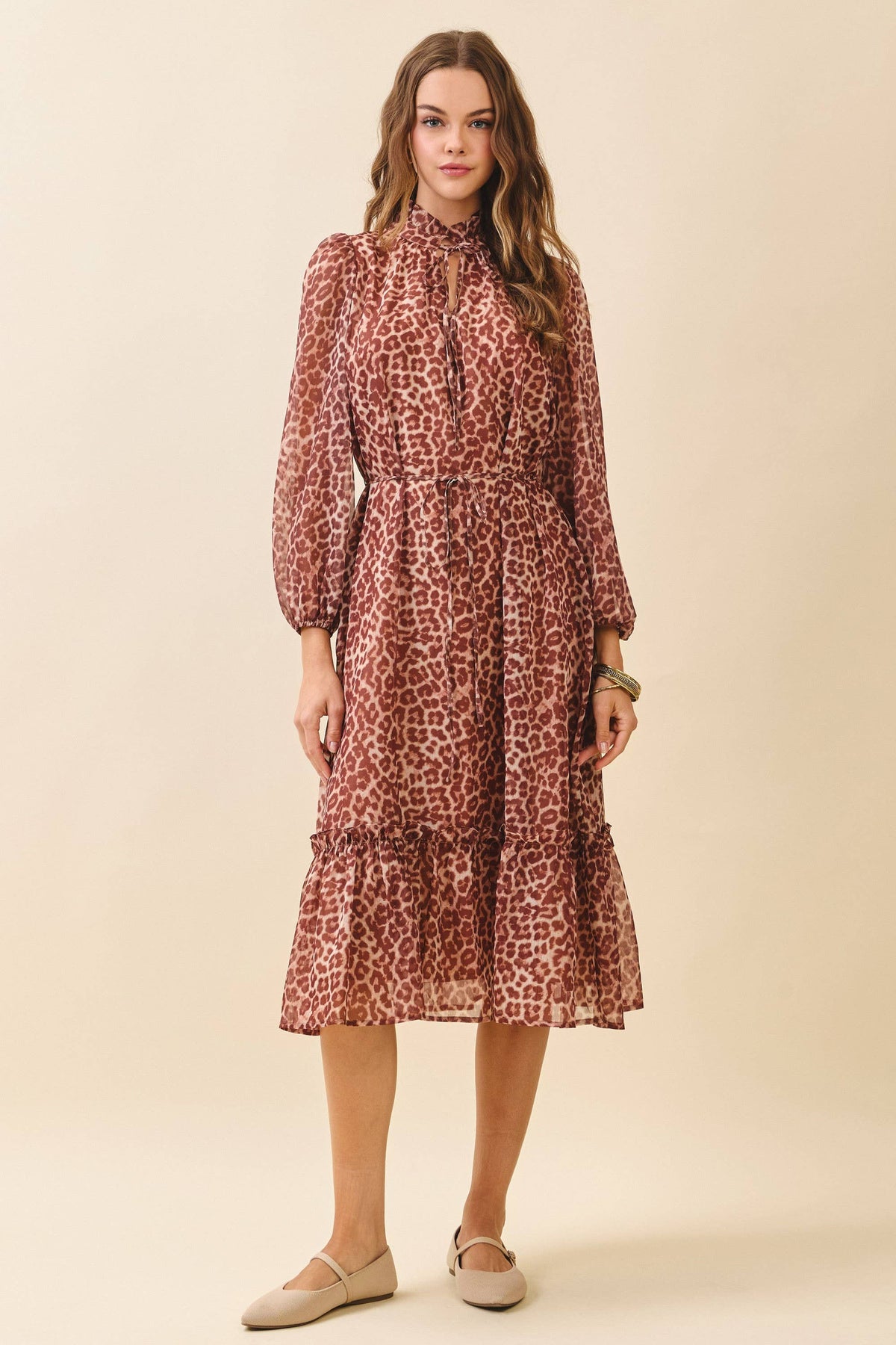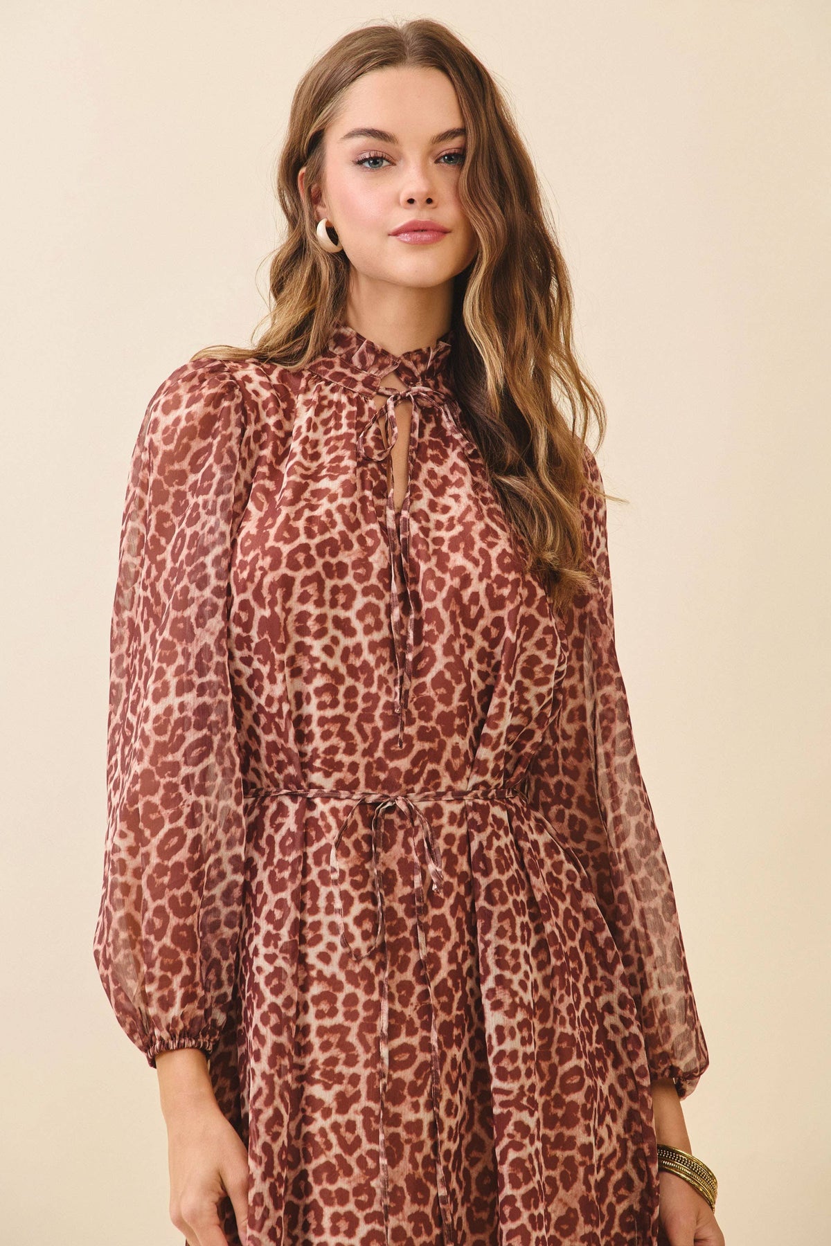 Leopard-print chiffon midi dress with a ruffled high neck, keyhole tie detail, and long puff sleeves. Features a tiered hem, removable waist tie, and full lining for coverage. Model Size + Fit: Model height: 5'11" Dress size: Small Bust: 31.5 Waist: 23.5 Hips: 35